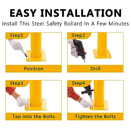 The yellow bollards with 4 anchor bolts areeasy to install in the baseplate with 4 pre drilled mounting holes. Assemblycan save your energy and timeThis protected steel column is erectedvertically to improve vision, protect entrances, parking lots, sidewalks,bicycle lanes, etc., and is usually used in traffic sensitive areas