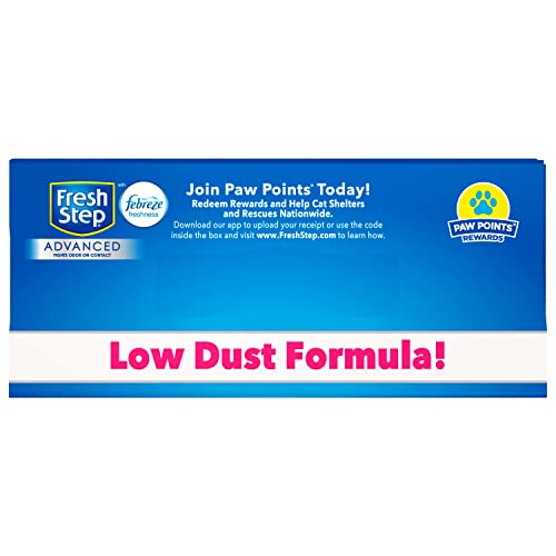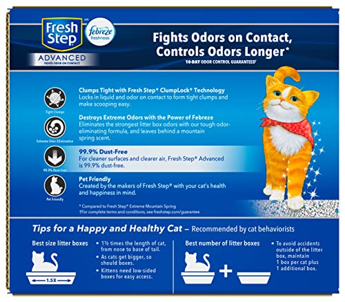 Details: Fresh Step Advanced Extreme clumping cat litter destroys extreme odors with the power of Febreze. It gets rid of the strongest litter box odors with a tough odor eliminating formula and leaves behind a fresh Mountain Spring scent. Fresh Step Advanced Extreme also uses Fresh Step Clumplock Technology, which locks in liquid and odor and creates tight clumps for easy scooping, and prevents stinky crumbles from being left behind. And, it is 99.9% dust free for cleaner surfaces, cleaner air and reduced tracking. Cleaning is fast and easy—just add more litter to your cat’s litter box after you scoop.